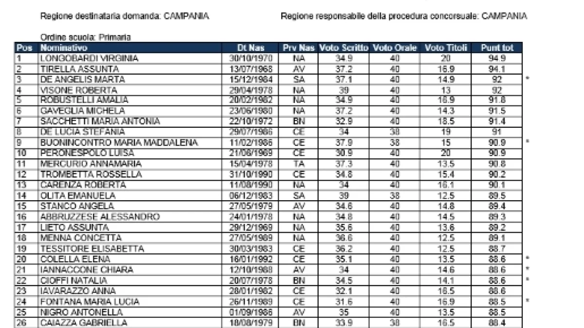 I candidati ammessi in graduatoria risultano essere 1765, con la candidata Virginia Longobardi in prima posizione con votazione di 94,9 punti. Vi ricordiamo che per i candidati con medesimo punteggio hanno precedenza coloro che sono in possesso di titoli di preferenza e minore età, o che sono in possesso di titoli di riserva. Le GM del concorso 2016 saranno utili per le immissioni in ruolo del triennio 2016/2018, esse sono formate da nome e cognome del candidato vincitore secondo l'ordine del punteggio finale raggiunto espresso in centesimi conseguito dai candidati e tento conto delle preferenze e precedenze a parità di punteggio. Infine, vi ricordiamo che per la scuola dell'infanzia sono ancora valide le graduatorie del concorso docenti 2012, che si cercherà di svuotare con la procedura indicata nel dm 496/2016.