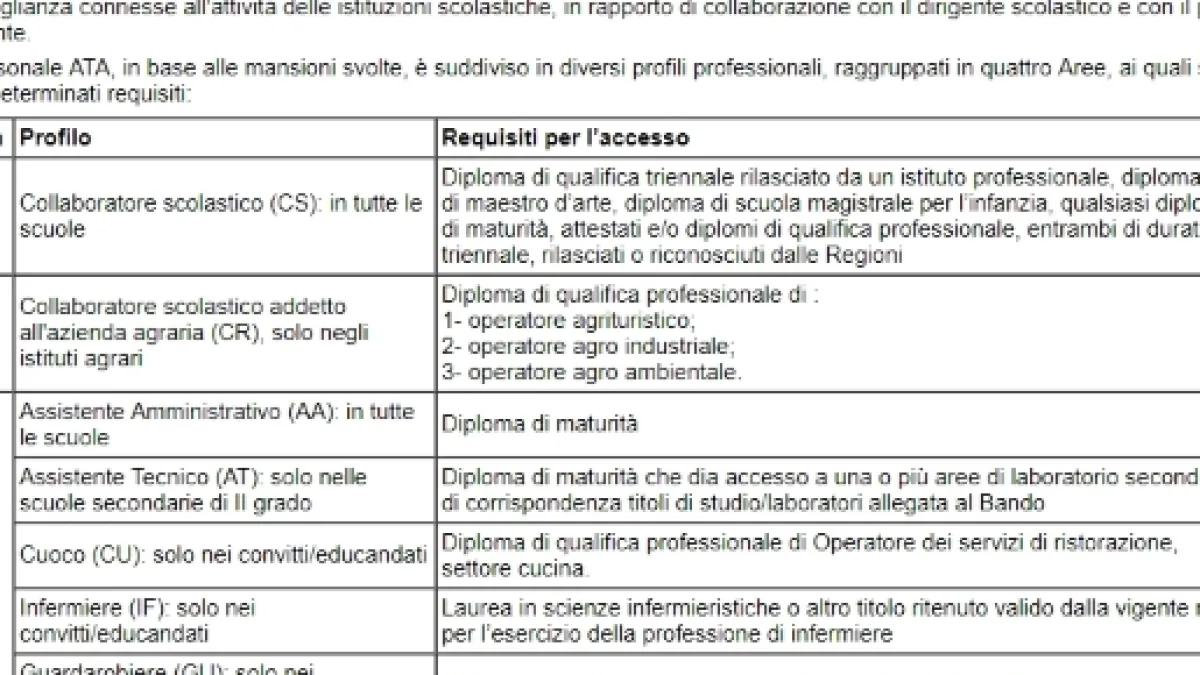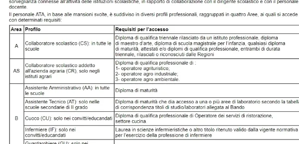 Il personale ATA, in base alle mansioni svolte, è suddiviso in diversi profili professionali, raggruppati in quattro Aree, ai quali si accede con determinati requisiti. Nello specifico vorremmo informarvi dei requisiti di accesso (per chi è la prima volta che presenta la domanda) alla mansione di collaboratore scolastico (bidello):