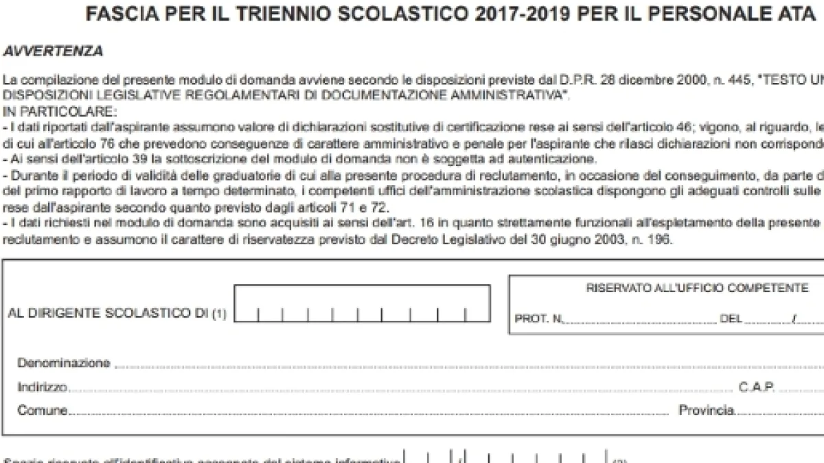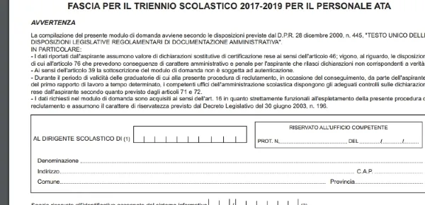 Come preannunciato da poche ore sono disponibili online i modelli per presentare la domanda di ammissione alle graduatorie di terza fascia del personale scolastico Ata. Nel dettaglio vorremmo fornirvi maggiori informazione su come compilare correttamente il modello D1, ovvero quello dedicato a chi per la prima volta si inserisce in tali graduatorie, per il conferimento di supplenze temporanee al personale amministrativo, tecnico e ausiliario.