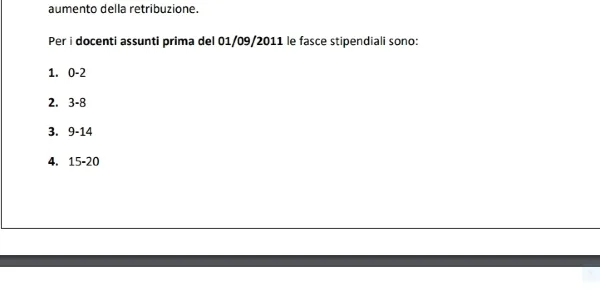 Prima di indicarvi le differenti fasce stipendiali al superamento della quale si ha un aumento della propria retribuzione, vorremmo chiarirvi cosa s'intende per anno di servizio intero. Nello specifico per anno scolastico intero di servizio s'intende, un periodo di servizio di 180 giorni che può partire da settembre o ininterrottamente dal primo febbraio sino al termine degli scrutini. Per quando riguarda le fasce stipendiali prima del 2011 erano sette ovvero: