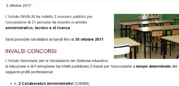 Il Sistema Nazionale per la Valutazione dell’Istruzione ha indetto un concorso pubblico nazionale, per titoli ed esami, per l’assunzione con contratto a tempo determinato della durata di 24 mesi, da assegnare al settore della ricerca valutativa. I posti banditi nel complesso sono pari a 23, il numero maggiore di posti ovvero 10 sono da attribuire all'attività di supporto alla realizzazione delle prove standardizzate.