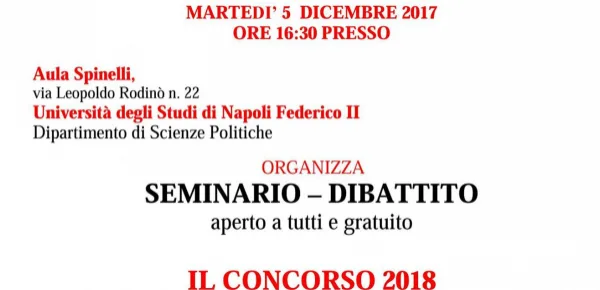 Si è svolto ieri pomeriggio, 5 dicembre 2017, presso l'Aula Spinelli del Dipartimento di Scienze Politiche dell'Università degli Studi di Napoli Federico II, il seminario-dibattito che ha avuto come oggetto le tematiche e le modalità di svolgimento del prossimo Concorso Scuola.