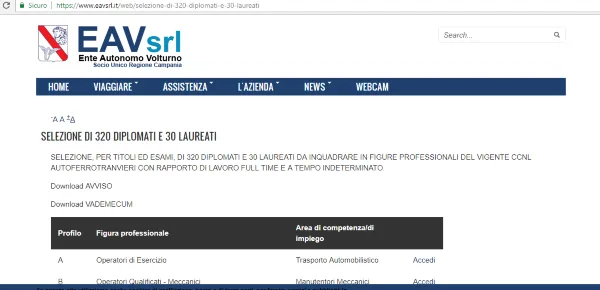 E' di oggi 10 agosto 2018, il comunicato stampa sulla pagina ufficiale Facebook della Regione Campania, riguardante la possibilità di potersi candidare al concorso indetto dall'azienda ferroviaria Ente Autonomo Volturno srl (EAV), che prevede 350 nuove assunzioni. La selezione avverrà per titoli ed esami, per un totale di 320 diplomati e 30 laureati da inquadrare in figure professionali del vigente CCNL autoferrotranvieri con rapporti di lavoro a tempo pieno e a tempo indeterminato.