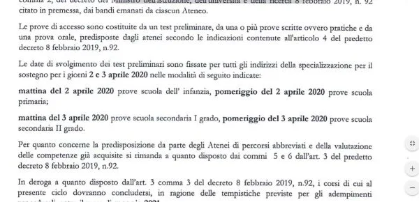 Stabilite anche le date delle prove di accesso disposte per le giornate del 2 e 3 aprile 2020 per tutti gli indirizzi della specializzazione sul sostegno. Previsto il maggio del 2021 quale termine dei corsi di formazione sul sostegno. Qualche novità invece sui requisiti di accesso e già precedentemente regolamentati nell'art. 3 comma 1 (Requisiti di ammissione e articolazione del percorso) e nell'art. 5 comma 2 (disposizioni transitorie e finali) del Decreto Ministeriale n.92/2019.