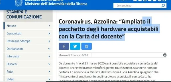 Il Ministro dell'Istruzione Lucia Azzolina precisa che l'ampliamento degli hardware acquistabili è solo una delle misure che sta mettendo in atto, per supportare le azioni di didattica a distanza. In quanto, al momento le scuole sono prontissime sul piano delle emergenze da incendio e terremoti, ma non altrettanto sul piano del contenimento della rapida diffusione e del contagio di un virus sconosciuto e contro il quale non esistono farmaci.