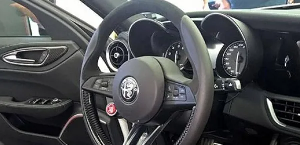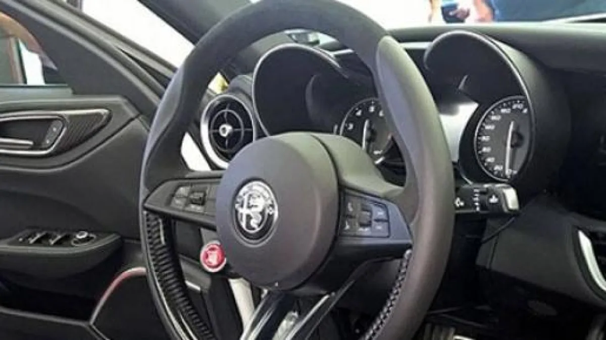 Il volante appare massiccio ma tuttavia maneggevole, e include anche il pulsante di avvio (in rosso) della Giulia. Denotano molta cura nei dettagli anche i particolari delle portiere, rivestite in pelle con cucitura bianca e con particolari alle maniglie in fibra di carbonio, Completano il tutto la sottile cornice satinata intorno all'altoparlante del sistema audio della macchina.