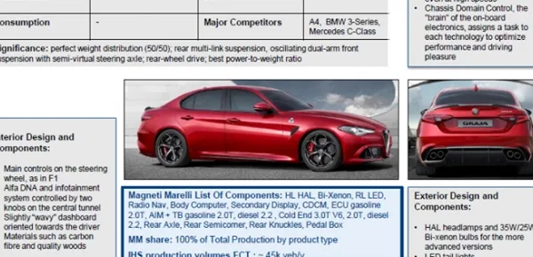 Magneti Marelli, storica azienda italiana leader del settore, fornirà numerosi componenti della nuova Alfa Romeo Giulia. Tra questi citiamo la centralina Chassis Domain Control che, in poche parole, sarà il vero cervello di questa automobile. Molto notevole anche il contributo offerto grazie al nuovo sistema di infotainment dotato di display TFT black panel da 8,8 pollici, che si preannuncia assai sorprendente e innovativo, interessante anche il contributo offerto dalla Prima Sole Components; Questa azienda molto conosciuta nel settore realizzerà per la Giulia i seguenti componenti: ripara sole, maniglie esterne e interne, modanature, plance, griglie, altoparlanti, batti calcagno.