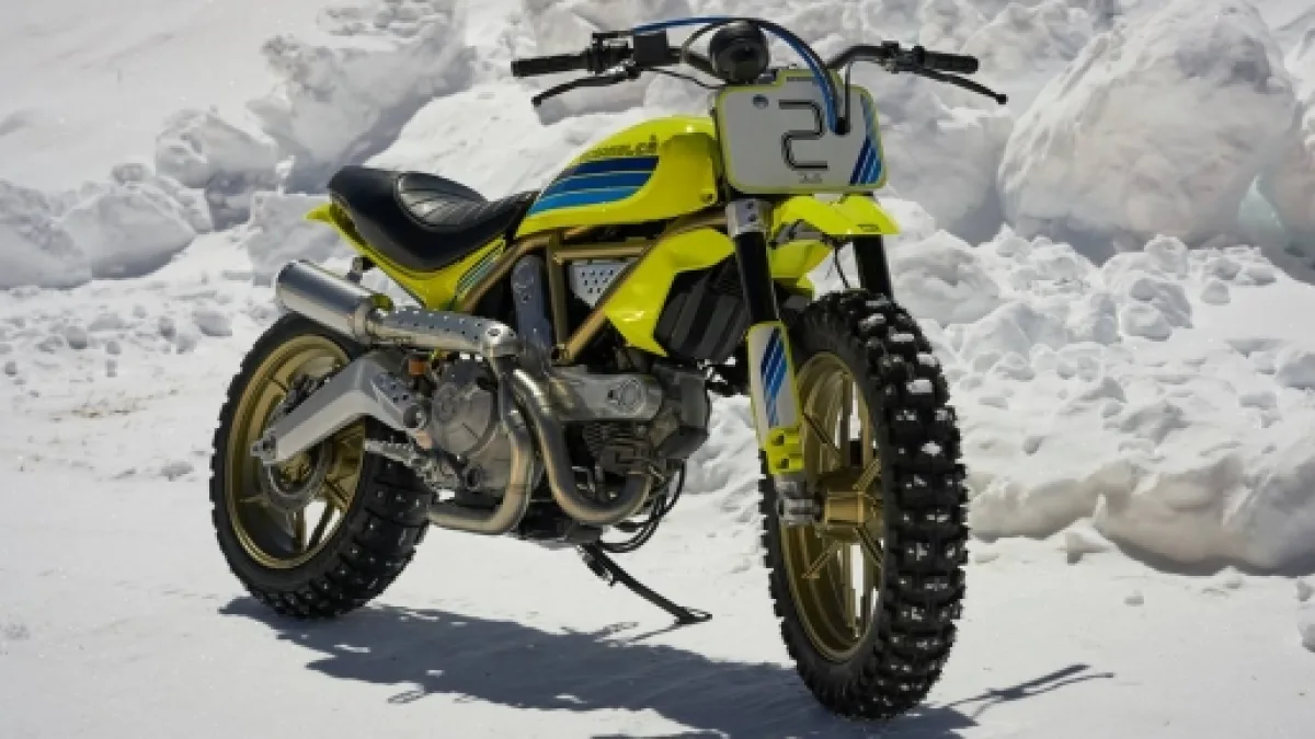 Ma questa è un’altra storia. Erano gli anni 70, anni in cui tornei monomarca erano al culmine dell’estrosità –almeno per i tempi - e riguardavano praticamente ogni settore dei motori. Alla Ducati fu chiesto di partecipare all’Ice Trophy e la casa di Bologna si presentò con la mitica Ducati Pantah Ice. Via i colori di serie e giallo e blu sulle carene. L’interpretazione che Dario Lopez ha dato di quella moto è proprio questa Ducati Scrambler Artik. Il giallo fluo e il blu richiamano la livrea della nobile antenata, mentre i cerchi sono oro, richiamando degli elementi del telaio. Il tocco in più lo danno le gomme Pirelli, che, come si nota dalle foto di presentazione – tutte rigorosamente su neve – oltre ad essere tassellate sono anche chiodate.