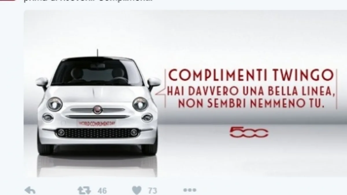 Un curioso episodio si è verificato nelle scorse ore su Twitter, celebre social network in cui le frecciatine tra vip sono all'ordine del giorno. Quest'oggi è stata 'Fiat Italia' a stuzzicare la casa automobilistica francese Renault. In occasione del World Compliment Day, che si svolgerà domani 1 marzo, la principale casa automobilistica italiana ha deciso di anticipare tutti di un giorno facendo lei per prima i complimenti a qualcuno.