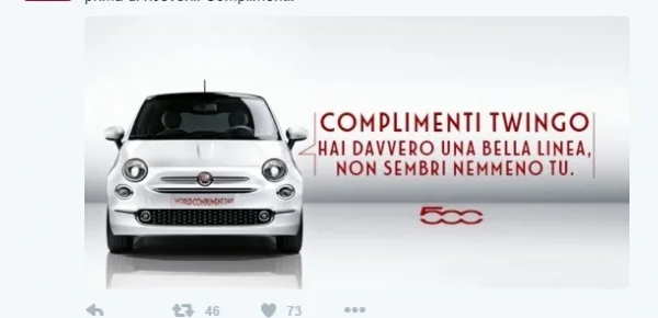 Fiat italia infatti ha deciso chiamare in causa con un 'Tweet' i rivali francesi di Renault, facendo un 'complimento' alla casa automobilistica francese per la nuova linea della celebre Renault Twingo. Questo 'complimento' a molti è sembrato una frecciatina indirizzata all'azienda transalpina, per la presunta somiglianza che la nuova Twingo avrebbe rispetto alla Fiat 500.