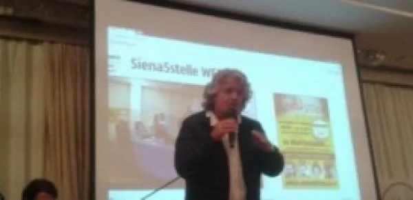 "Andiamo avanti. Dobbiamo cercare di capire cosa sarà l'Italia tra cinque o sei anni. Il Paese non c'è più". Così Grillo, ieri, in un passaggio dell'incontro "Parlamento in MoVimento" svoltosi a Siena. Comparso a sorpresa nella saletta, gremita, il leader del "suo" Movimento ha raggiunto il tavolo degli oratori con in testa una bandiera dell'Europa. L'amata-odiata Europa. Alla presenza dei parlamentari Artini, Ruocco, Fraccaro e Di Battista, il leader genovese ha dettato la sua linea.
