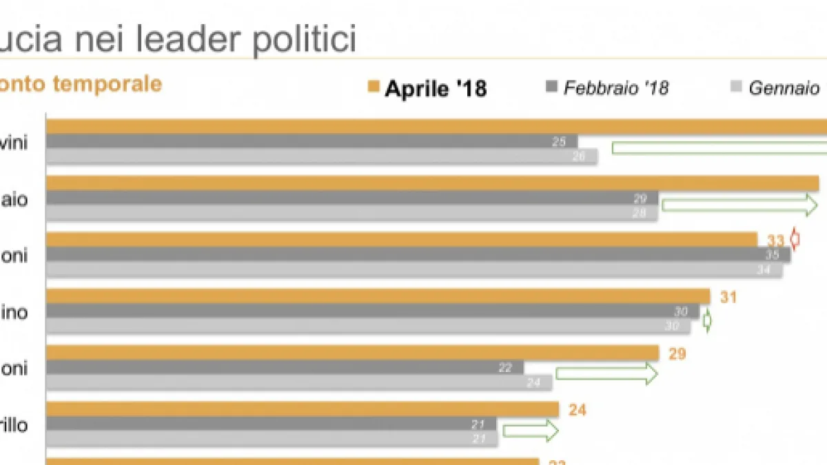 Guadagnano posizioni di affidabilità Luigi Di Maio e Matteo Salvini, mentre cala quella di Matteo Renzi.