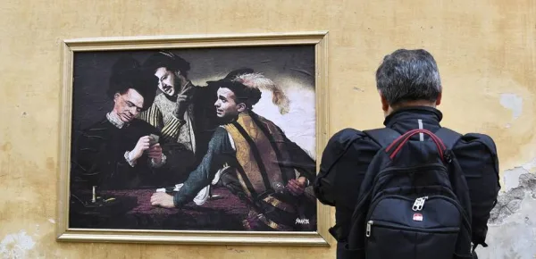 Una volta scoperto, i carabinieri hanno subito rimosso l'opera di 'street art', che si trovava di fronte alla sede dell'Agenzia Ansa. Il quadro rappresenta una truffa: un anziano gioca a carte contro un suo rivale senza sapere che, l'uomo al suo fianco è in complotto contro di lui e da suggerimenti al compagno sulle carte che ha in mano 'l'ingenuo' anziano.