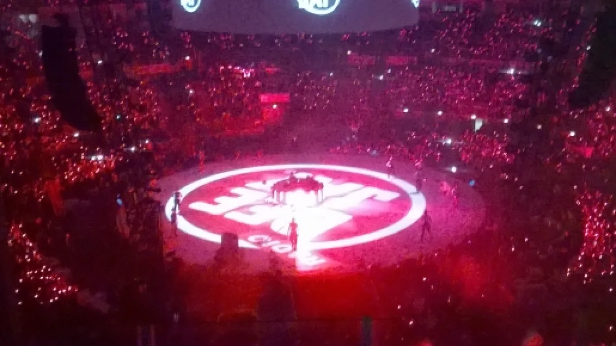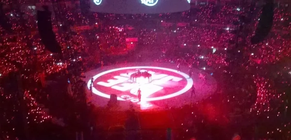 È grazie a un palco circolare e a sei schermi sospesi subito sotto il soffitto che tutto il pubblico riesce a partecipare pienamente allo show e ne diventa quasi protagonista grazie ai braccialetti luminosi.