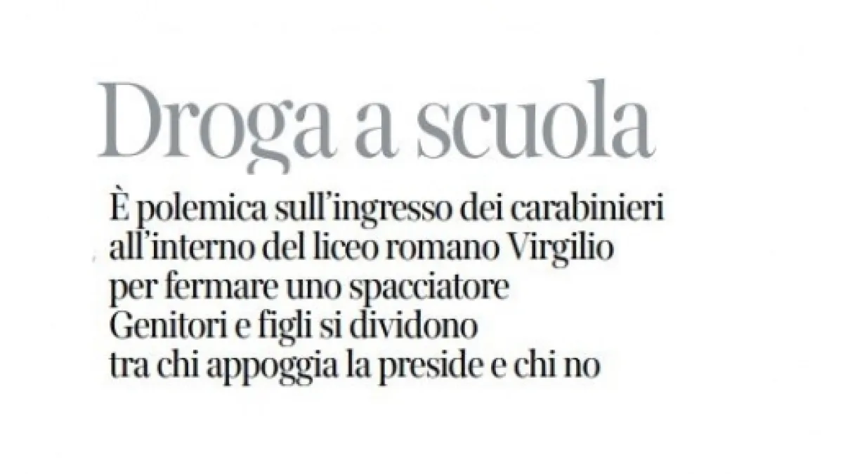 Si riaccende il dibattito sul caso del liceo 'Virgilio' di Roma dove, lo scorso 22 marzo, un blitz dei carabinieri portò all'arresto di uno studente diciannovenne per spaccio di droga. Un articolo de 'Il Corriere della Sera', in edicola quest'oggi, giovedì 7 aprile, parla dello scontro in atto tra la preside dell'Istituto, Irene Baldriga, e una rappresentanza di genitori che poco hanno gradito l'intervento delle forze dell'ordine.