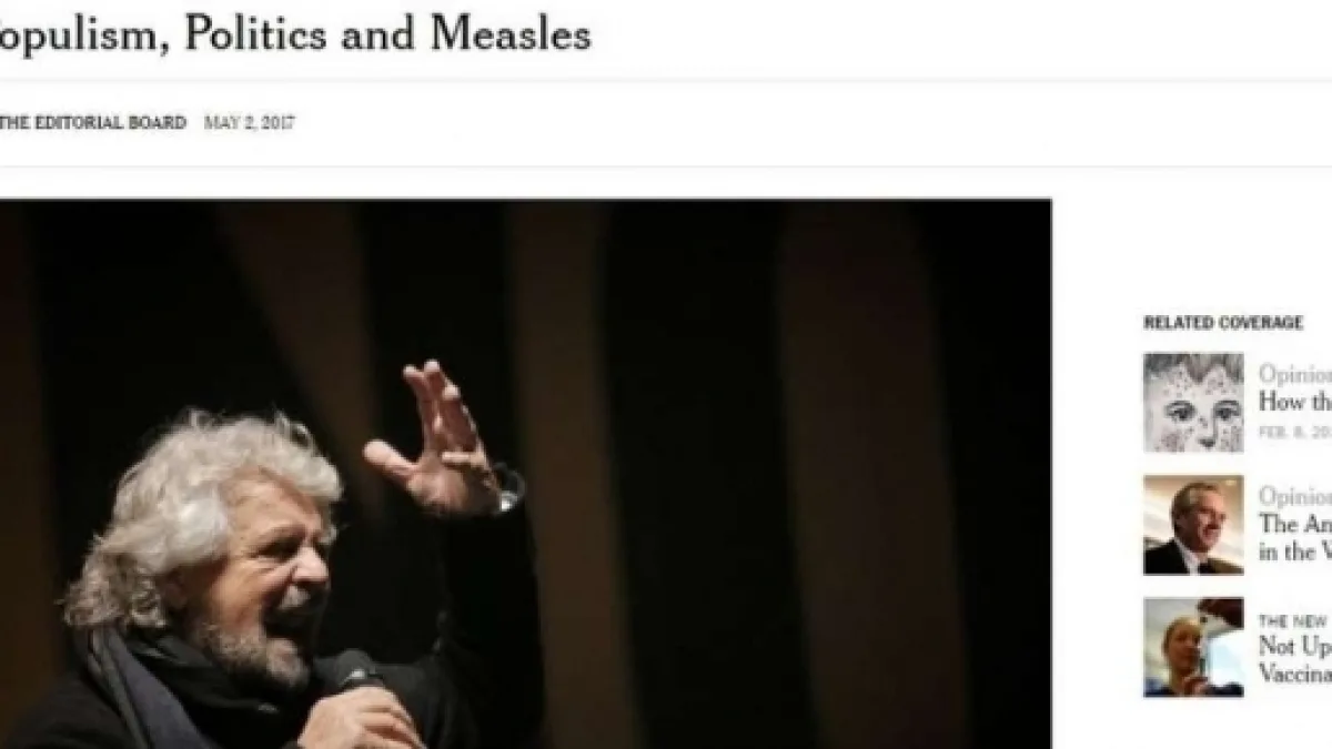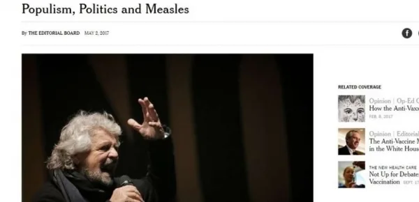 Il 2 maggio scorso il New York Times ha pubblicato un editoriale con il titolo evocativo di "Populismo, politica e morbillo". Prendendo in analisi l'esponenziale aumento dei casi di morbillo in Italia, fa derivare il processo, in parte, alle continue campagne anti-vaccinazione dei cosiddetti leader populisti. L'editoriale del New York Times parla di questo scetticismo crescente nei confronti dei vaccini come di una delle "tragedie di questi tempi di post-verità" e mette in guardia dalle continue illusioni e fake news diffuse da media e leader populisti.