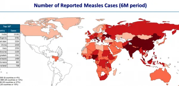 Nella mappa disegnata su base semestrale dall'OMS, spicca con una certa evidenza il colore assegnato al nostro paese: solo otto paesi, pari al 4% di quelli presi in esame dallo studio, presentano un numero di casi di morbillo superiori a 1000 unità e si tratta, in ordine decrescente di India, Nigeria, Pakistan, Cina, Italia, Ukraina Bangladesh e Malaysia.