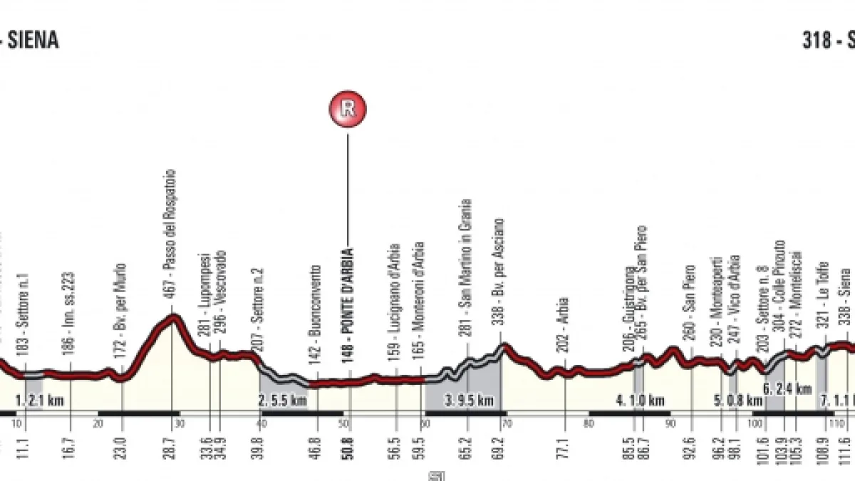 Il più difficile è quello che passa dal paese di Monte Sante Marie. E’ un settore sterrato di circa 11 km con saliscendi molto impegnativi, che già a 50 km dall’arrivo hanno sempre proposto una selezione netta. Da qui la corsa sarà una battaglia tra i grandi, con gli ultimi settori sterrati di Colle Pinzuto e Le Tolfe che possono lanciare l’azione definitiva. Anche il finale è di straordinario valore tecnico e scenografico. Si entrerà a Siena da via Esterna di Fontebranda, transitando sotto l’arco omonimo subito dopo l’ultimo km. La strada, stretta e su lastricato, raggiunge pendenze fino al 16% per poi spianare negli ultimi 300 metri che portano all’imbocco di Piazza del Campo, dove la corsa si conclude.