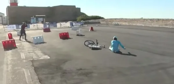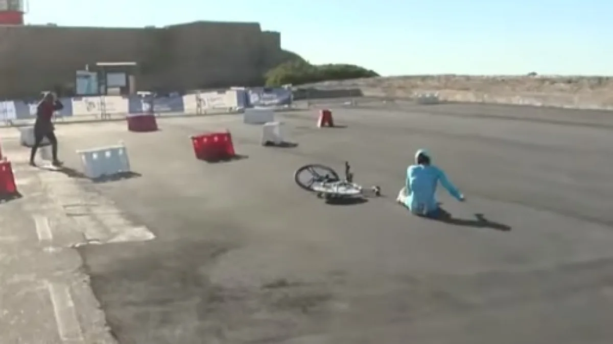 Il corridore spagnolo della Astana era incalzato da Geraint Thomas, che lo seguiva a 5’’ in classifica, ma aveva tutte le chance di compiere una bella crono e giocarsi poi la vittoria finale nell’ultima tappa con arrivo in salita ad Alto de Malhao. Invece, dopo aver fatto segnare un buon sesto tempo allo stop di metà percorso, è incappato in una caduta che l’ha costretto al ritiro. Sanchez è finito per terra in una curva verso destra particolarmente sporca e con fondo irregolare, quasi completamente coperta di sabbia nella parte più interna. Sanchez è entrato con grande sicurezza, ma complice anche il vento, ha messo la ruota sulla sabbia ed è scivolato via picchiando il volto sull’asfalto.