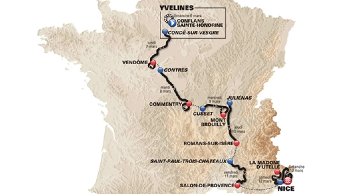 La ‘corsa del sole’, così viene chiamata, verrà inaugurata il 6/03 con il prologo di Conflans Sainte-Honorine (6,1 Km); il giorno seguente (7/03) si partirà da Condé-sur-Vesgre e si giungerà a Vendôme, lungo un tragitto di 195 chilometri caratterizzato dalla presenza di un paio di settori sullo sterrato. Si proseguirà l’8/03 con la tappa Contres-Commentry di 214 chilometri, la più lunga di questa edizione, dove le insidie saranno date dal vento. La frazione seguente, di scena il 9/03, porterà i corridori da Cusset fino in cima al Mont Brouilly, primo arrivo in salita della Parigi-Nizza; il percorso non sarà affatto facile e misurerà 165,5 chilometri.