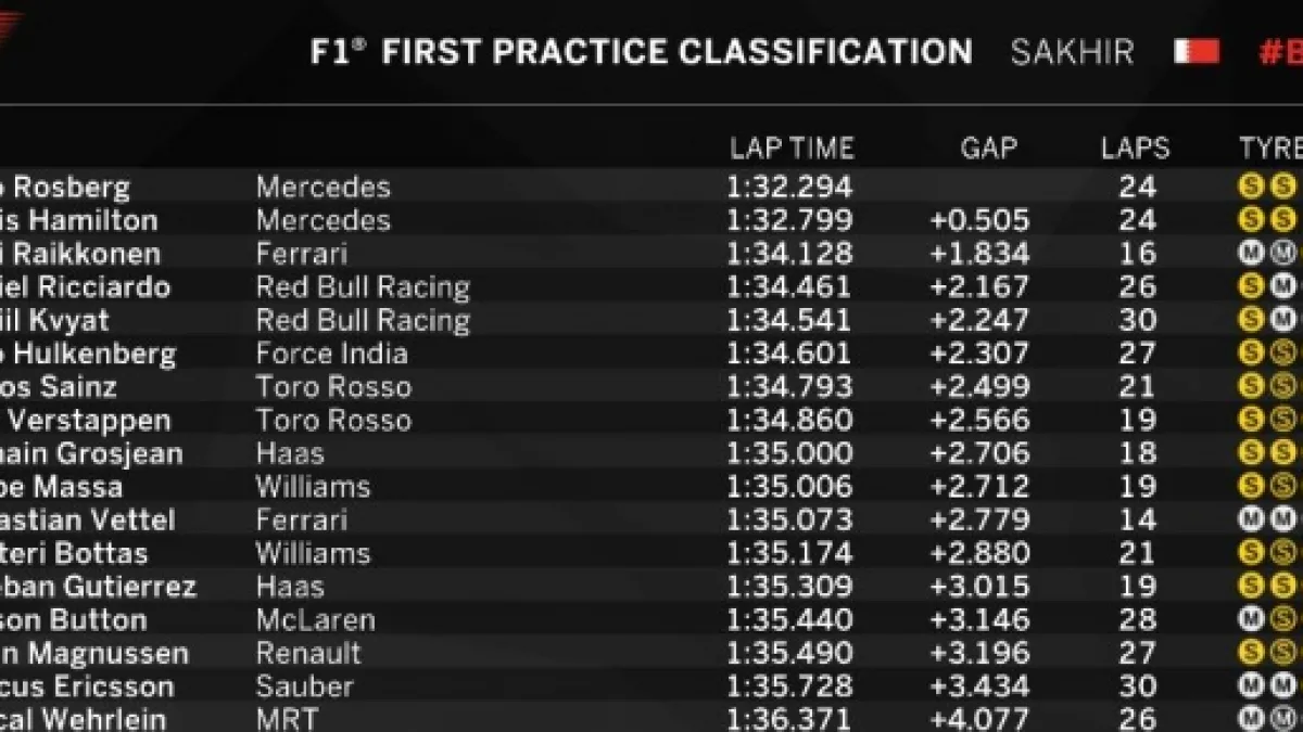 La prima sessione di prove libere in Bahrain è subito targata Mercedes: Rosberg ha fatto segnare uno straordinario 1.32.294 (migliorando la pole dello scorso anno) precedendo Lewis Hamilton di mezzo secondo. La Ferrari di Raikkonen ha girato con la stessa gomma solo nell'ultima parte della sessione: Kimi ha chiuso in terza posizione ma con un divario superiore a 1.8 secondi.