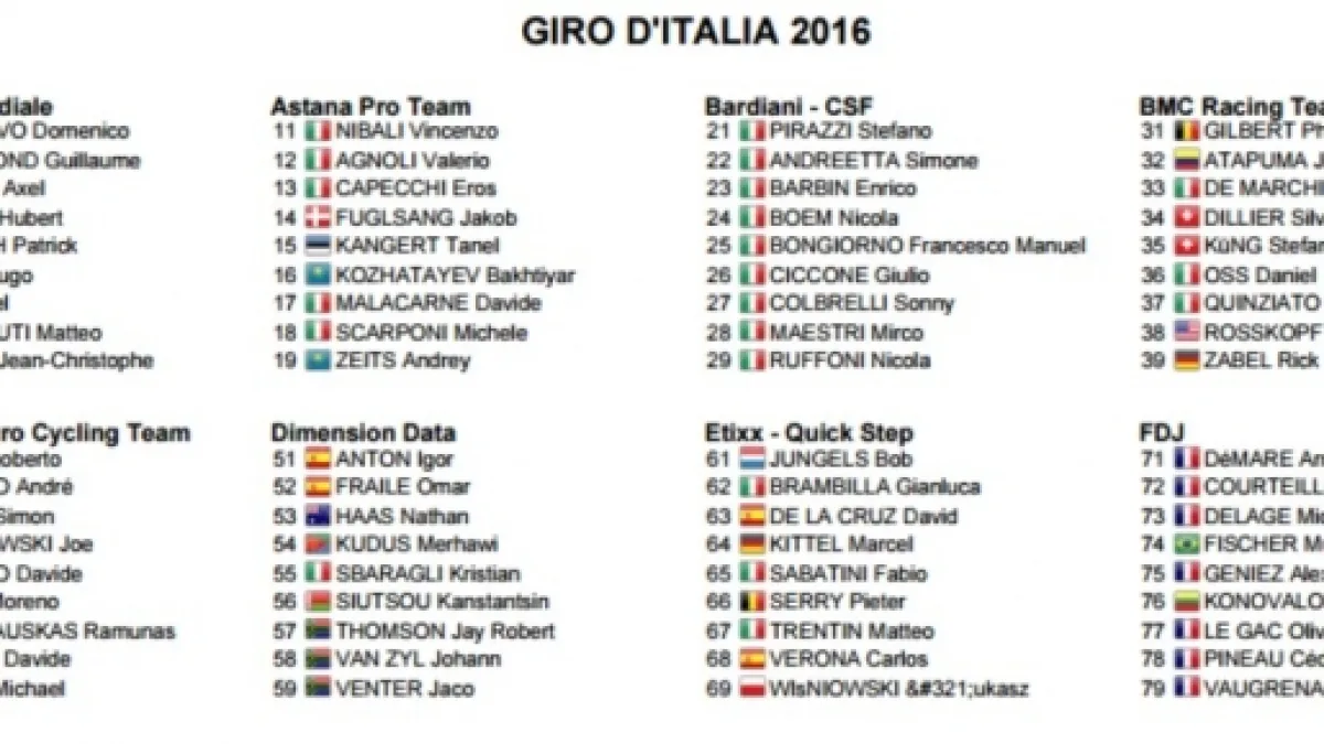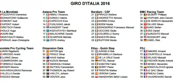 A poco più di due settimane dal via del Giro d’Italia 2016 ecco finalmente la lista dei corridori iscritti alla corsa rosa. Non è ancora l’elenco definitivo perché, fino alla vigilia, le squadre avranno l’opportunità di fare delle modifiche, ma la starting list finale non si discosterà di molto da questa. Tra i papabili per la maglia rosa spiccano i nomi di Nibali, Landa, Uran, Valverde.