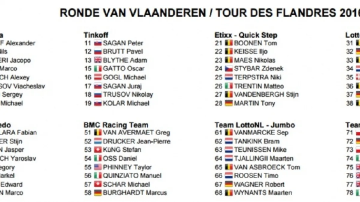 Al via ci saranno 25 squadre composte da 8 corridori ciascuna: 200 uomini pronti a lanciarsi tra le stradine, i muri, il pavè e i pericoli che in una corsa come il Giro delle Fiandre sono in ogni curva. Il pronostico si riversa principalmente su due nomi, Peter Sagan e Fabian Cancellara. Sono i due campioni che fin qui hanno dato quel qualcosa in più, senza nascondersi, raccogliendo vittorie e applausi.