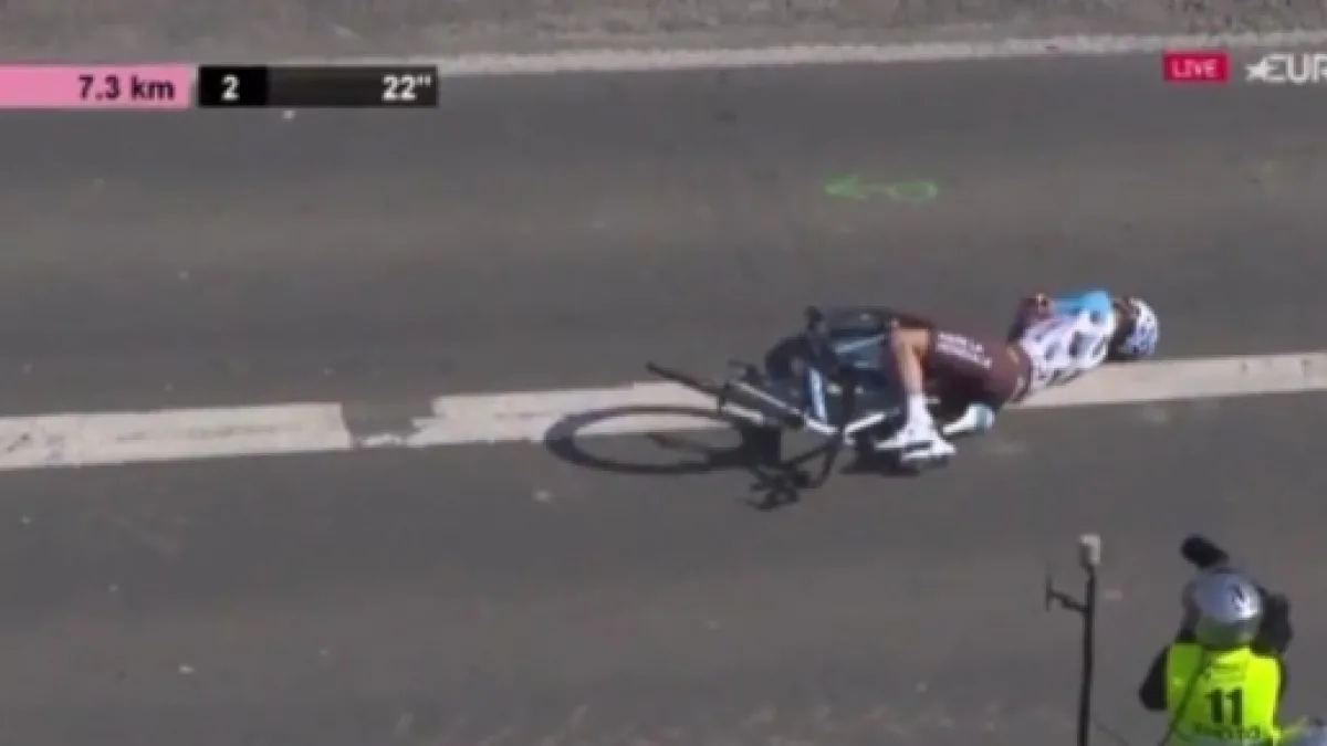 Dopo qualche decina di metri il pilota della moto di ripresa tv si è reso conto dell’errore di percorso commesso e senza guardare dietro ha girato per invertire il senso di marcia e tornare nel tracciato giusto. Ma così il motociclista ha tagliato la strada ai corridori che lo avevano seguito nel suo errore alla rotonda e Quentin Jaregui ha centrato la moto.