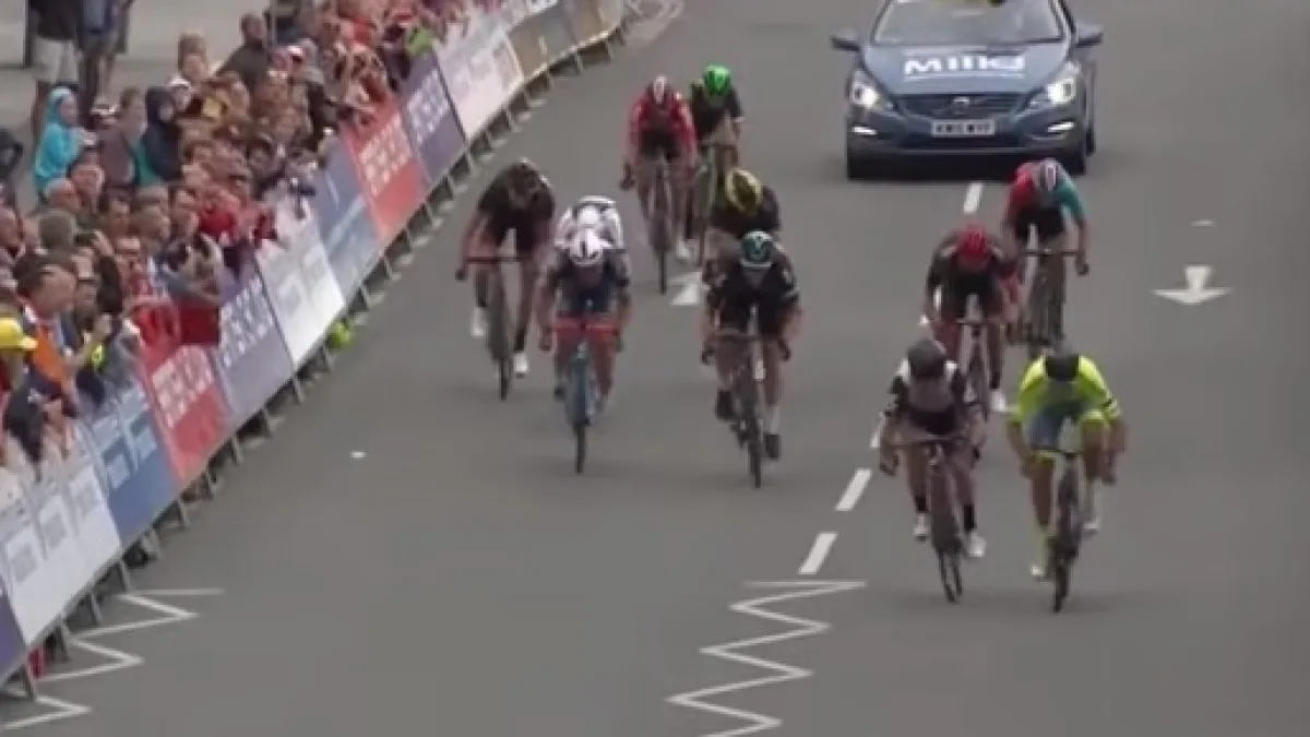 Nel finale Cavendish ha lanciato la sua volata, ma nelle ultime decine di metri la sua azione si è spenta, porgendo il fianco alla rimonta di Adam Blythe, ancora molto forte nonostante la lunga fuga in cui si era impegnato. Blythe ha così regalato il titolo alla Tinkoff, davanti a Cavendish e Fenn.