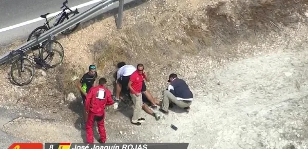 La strategia della Movistar non è però andata a buon fine perché verso metà tappa Josè Joaquim Rojas è caduto. I fuggitivi stavano affrontando un tratto in discesa quando una macchina del seguito della corsa si è trovata nel posto sbagliato al momento sbagliato, proprio in mezzo ai corridori lanciati a tutta velocità. Rojas si è trovato davanti la macchina mentre stava impostando una curva veloce a destra. Lo spagnolo ha dovuto allargare la traiettoria per dribblare la macchina, finendo per cadere, passare sotto il guardrail e finire fuori strada.