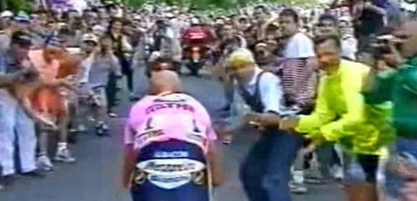 Era la 15° tappa del Giro ’99, la Racconigi – Oropa, quando il Pirata rimase attardato all’inizio della salita per un salto di catena. La rimonta del campione con un sorpasso dietro l’altro è rimasta nella storia del ciclismo.
