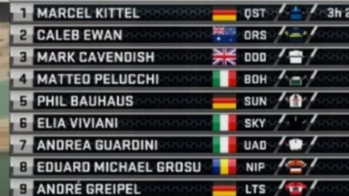 La lotta tra le squadre dei velocisti più attesi è stata intensissima, con la Quickstep di Kittel che però non ha fatto il classico treno. La Dimension Data si è presentata davanti all’ultimo chilometro per Cavendish, ma poi Renshaw ha dovuto mollare il suo capitano sulla ruota degli Orica Scott, arrivati davanti con miglior tempismo. Caleb Ewan si è così trovato a sprintare dalla testa con Cavendish a ruota. Il giovane australiano, accucciato come sempre sul manubrio, ha resistito alla grande al tentativo di rimonta del britannico, ma quando sembrava ormai materializzarsi il successo è spuntato da dietro Marcel Kittel. Il tedesco nelle ultime pedalate ha passato a doppia velocità Ewan che già stava alzando le braccia, andando così a vincere per mezza ruota.