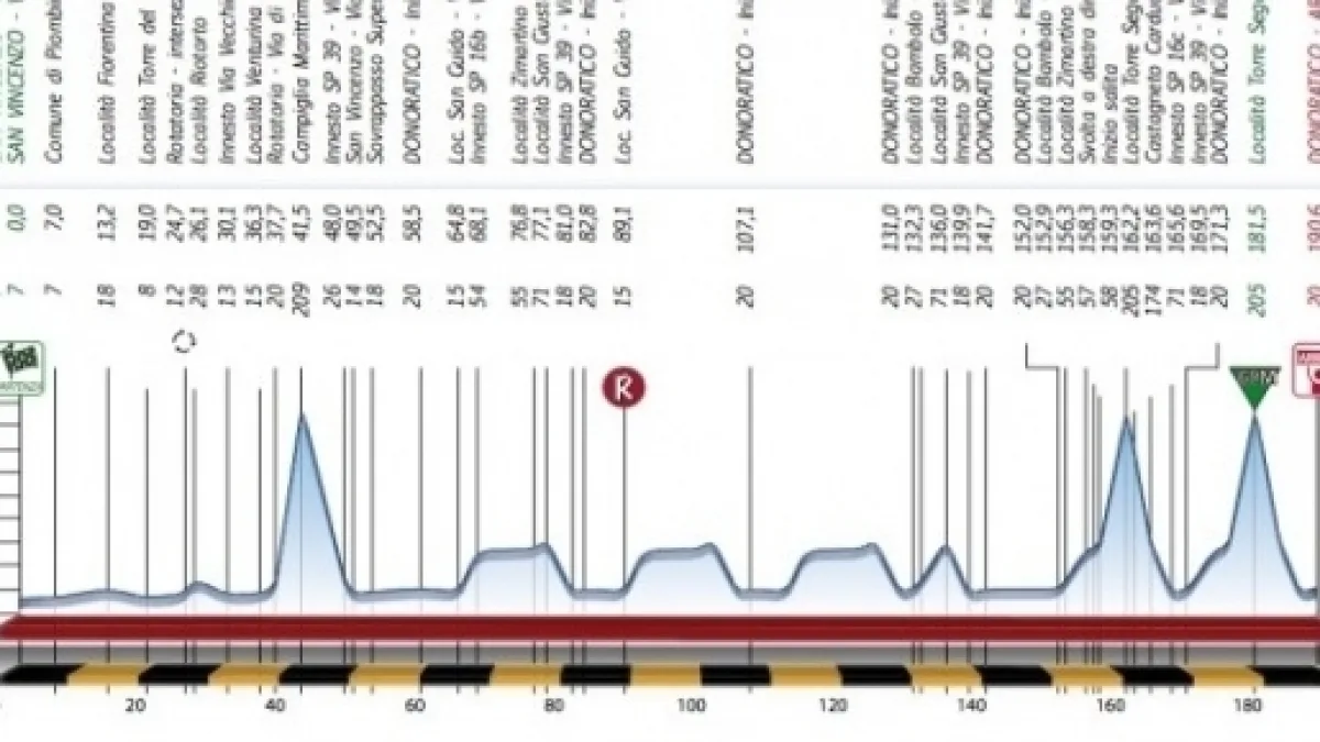 La partenza sarà da San Vincenzo, sempre sulla costa livornese. Dopo un primo tratto in linea di una sessantina di km la corsa entrerà in una serie di tre circuiti che ruotano attorno a Donoratico, classica sede d’arrivo. Il primo è di 24 km, sarà affrontato tre volte, e comprende il passaggio sul suggestivo viale di Bolgheri cantato dal Carducci. Il secondo è di una decina di km, ancora pianeggiante e da ripetere per due volte. L’ultimo, di circa 20 km da affrontare due volte, è quello che comprende le scalate alla salita di Torre Segalari. L’ascesa è irregolare, con dei veri e propri muri fin sul 15% alternati a tratti di recupero. Lo scollina mento è ad una decina di km dal traguardo di Donoratico.