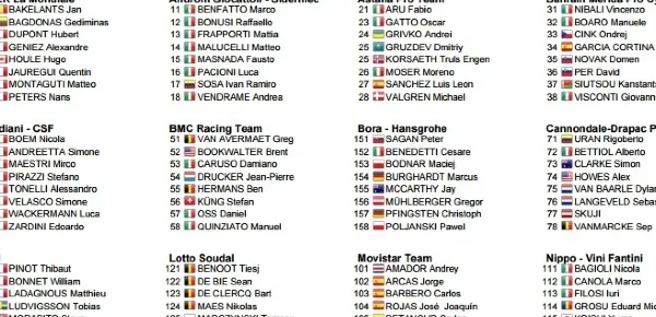 Mancherà invece Daniele Bennati, costretto a dare forfait alla vigilia per l’influenza. Ci sarà infine da valutare l'incognita del meteo: per domani è previsto vento piuttosto forte e possibilità di qualche scroscio di pioggia.