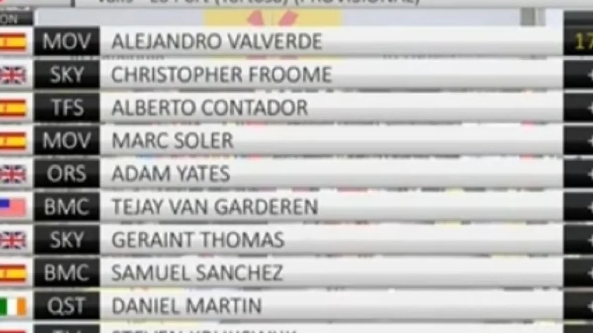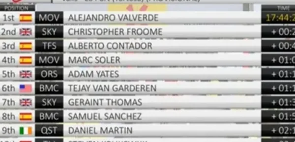 Contador ha poi fatto selezione con un bello scatto, ma Valverde e Froome sono stati in grado di reagire con sicurezza, ed anche Soler e Adam Yates si sono riportati sotto. Soler ha svolto un lavoro di gregariato fantastico per Valverde, tirando il gruppo nella fase finale della salita. Valverde poi non si è accontentato di regolare gli avversari con la sua ormai classica volata, ma ha provato a vincere da fuoriclasse, senza aspettare fino all’ultimo. Con una progressione da campione ha lasciato sul posto Froome e Contador spianando l’ultimo chilometro della salita, con la voglia di riparare alla presunta ingiustizia subita nella cronosquadre. Valverde ha chiuso da trionfatore assoluto, con Froome e Contador a 13’’ e Adam Yates a 32’’.