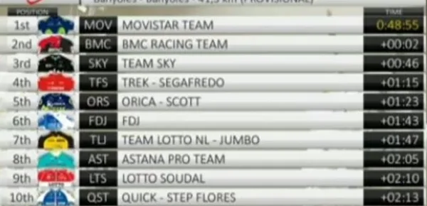 Come era facile prevedere, la lunga cronosquadre della seconda tappa ha già dato un volto molto significativo alla classifica generale della Volta Catalunya. La Movistar di Valverde ha conquistato il successo battendo a sorpresa la BMC di un paio di secondi. Dietro i distacchi sono stati molto ampi, con la Sky di Froome e Thomas staccata di 46’’ e la Trek di Contador a 1’15’’.