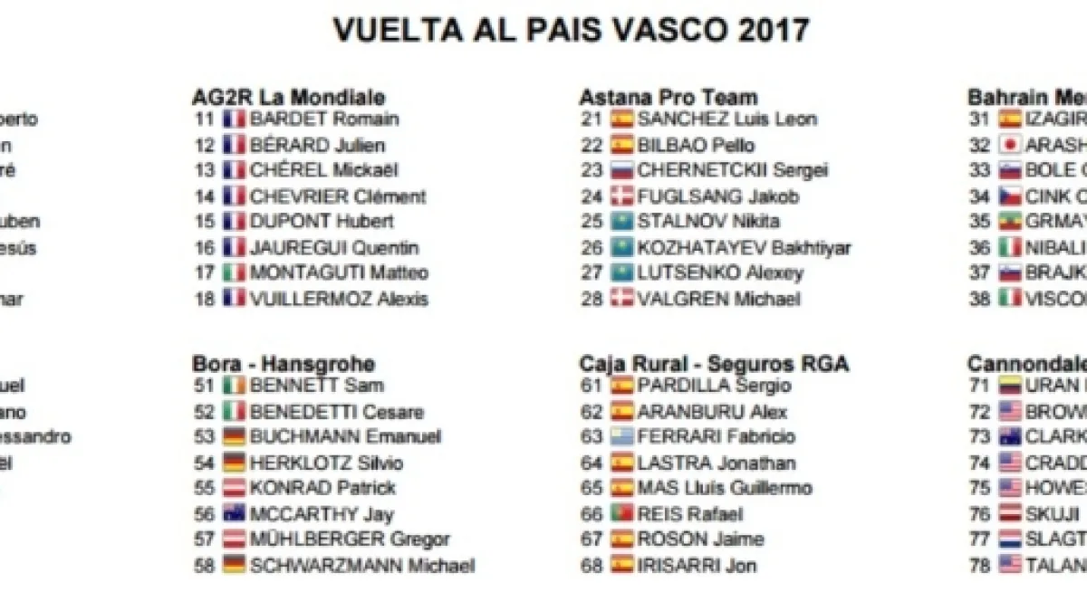 La Trek di Contador porterà una formazione senza i corridori migliori, mentre la Movistar affiancherà Dani Moreno, Ruben Fernandez e Gorka Izagirre al leader Valverde, ponendosi come possibile faro della corsa. Tra gli altri uomini da classifica spiccano Sergio Henao, Romain Bardet, Jakob Fuglsang, Ion Izagirre, Rigoberto Uran, Simon Yates, Julian Alaphilippe, Simon Spilak, anche se la crono finale potrebbe avvantaggiare corridori come Michal Kwiatkowski e Primoz Roglic. Per le prime due tappe più facili l’uomo da battere si preannuncia Michael Matthews, mentre tra gli altri uomini veloci solo Bennett, Lobato e Swift hanno accettato la sfida di una corsa impegnativa come il Giro dei Paesi Baschi. Tra gli italiani il più atteso è Diego Ulissi, a caccia di una tappa ma anche di una buona classifica.