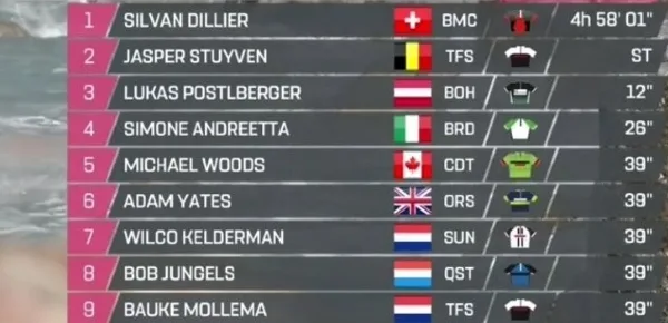 Gli ultimi 2 km di salita verso Terme Luigiane si sono trasformati in una partita a scacchi in cui Postlberger ha mollato per primo e Dillier ha lanciato lo sprint. Stuyven ha cercato la rimonta ma non è riuscito a far valere al meglio il suo spunto veloce, un po’ appannato evidentemente dalle pendenze e dalla fatica accumulata. Silvan Dillier è andato a vincere sul belga, con Postlberger terzo e Andreetta che ha difeso i quarto posto dal ritorno del gruppo. Nibali, Quintana e gli altri uomini di classifica sono arrivati insieme, per una generale ancora ferma alla maglia rosa di Bob Jungels con tutti gli altri ad una manciata di secondi.