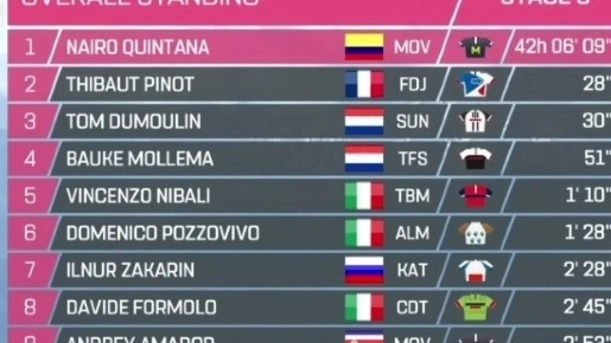 Nairo Quintana non ha avuto flessioni nel finale ed è andato a vincere con 24’’ su Pinot e Dumoulin, 41’’ su Mollema e 1’ su Nibali, con Pozzovivo poco dietro. Lontanissimi tutti gli altri, con Zakarin ad oltre due minuti, Kruijswijk e Formolo quasi a tre, la maglia rosa, ormai ex, di Jungels ancora più dietro. Geraint Thomas ha concluso la sua scalata da calvario ad oltre cinque minuti. Ora in classifica Quintana passa in rosa con Pinot e Dumoulin a 28’’ e 30’’, mentre Nibali è a 1’10’’. Martedì il Giro d’Italia ripartirà con la crono di Montefalco, in cui Tom Dumoulin potrebbe andare a caccia del primato.