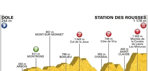A questo punto si tornerà a salire verso la Côte de Viry (2ª categoria). Questa salita misurerà 7,6 Km e proporrà pendenze medie al 5,2%. La successiva discesa porterà a Choux, poi ci sarà un breve tratto in salita ed un’altra discesa verso Saint-Claude. In questa località comincerà l’ascesa al Montée de la Combe de Laisia-Les Molunes. La salita misurerà 11,7 Km e proporrà pendenze medie al 6,4%. Si arriverà a quota 1.202 Mt di altitudine poi si proseguirà per un tratto in falsopiano. A circa 5 Km dal traguardo di Station des Rousses si incontreranno delle pendenze del 6%, che gradualmente si addolciranno fino all’arrivo, ben diverso da quanto visto a La Plance des Belles Filles con il successo di Fabio Aru.