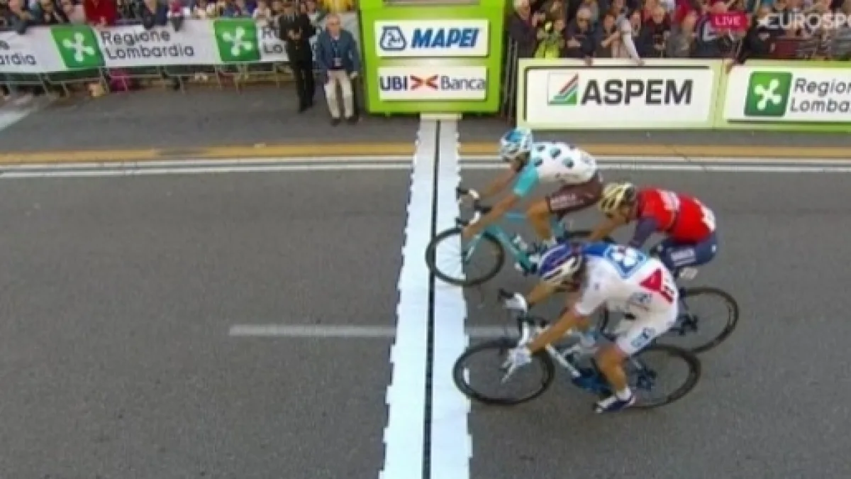 Un eccellente Giovanni Visconti ha tirato a lungo nel finale per preparare l’affondo di Nibali che è puntualmente arrivato dopo che tutti lo attendevano, all’inizio dell’ultimo passaggio dalla salita di Bobbiate. Nonostante le pendenze abbastanza morbide, il campione siciliano ha affondato con il lungo rapporto e solo Thibaut Pinot (FDJ) ha avuto la forza e la reattività per riportarsi sulla sua ruota. I due hanno collaborato negli ultimi 3 km, con Gianni Moscon (Sky) che ha cercato di rilanciare l’inseguimento in un gruppetto con anche Ulissi (UAE) e Aru (Astana). Ma alla fine del lavoro del giovane trentino ha approfittato Alexandre Geniez (AG2R). Il francese ha aspettato che Moscon riducesse le distanze per poi rientrare nelle ultime centinaia di metri, seguito da vicino da Ulissi.