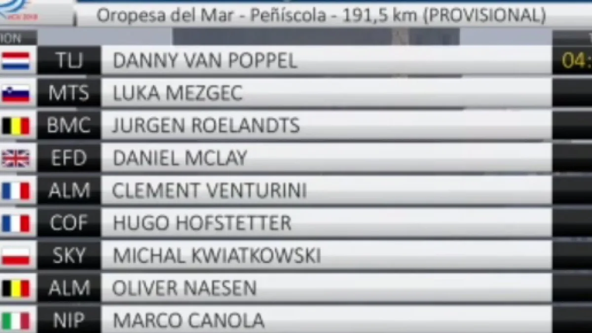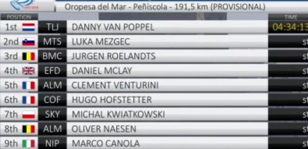 Secondo posto per lo sloveno Luka Mezgec (Mitchelton) e Roelandts (BMC). Nono posto per Canola e quindicesimo per Matteo Moschetti, debuttante della Polartec, la squadra di Contador e Basso che è il vivaio della Trek. Domani i velocisti avranno un'altra occasione, quindi la cronosquadre e un arrivo in salita molto impegnativo daranno i verdeti sulla classifica generale di questa Volta Valenciana.
