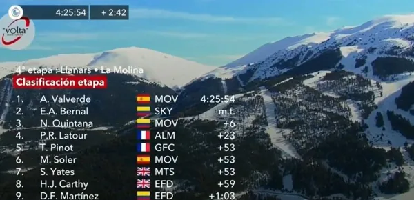 Grande spettacolo nella quarta tappa della Volta Catalunya, il tappone di montagna con arrivo in quota a La Molina. Alejandro Valverde ha vinto ancora, continuando il suo inizio di stagione pirotecnico con già sette vittorie messe nel carniere. La Movistar si è dimostrata fortissima, con Quintana e Soler al servizio del fuoriclasse murciano, ma ha dovuto fare i conti con il giovane colombiano Egan Bernal.