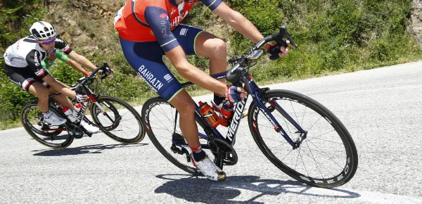 Da lontano emerge una figura rossa e blu, è Vincenzo, con la divisa della Bahrein Merida, che pedala concentrato, con la testa bassa e pieno di determinazione.