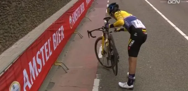 L’episodio che ha fatto tanto discutere nel mondo del ciclismo negli ultimi giorni è iniziato quando l’Amstel Gold Race stava per affrontare il suo ultimo passaggio sulla salita del Cauberg. Primoz Rogliĉ è stato costretto a fermarsi per un problema alla sua bicicletta, ha alzato la ruota posteriore e fatto girare i pedali con le mani azionando anche i pulsanti del cambio.