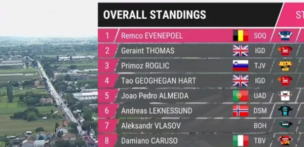 Con questo risultato Evenepoel strappa la maglia rosa a Leknessund, oggi a 1'15'', ma arriverà alle tappe di montagna con gli avversari molto più vicini del previsto. Thomas è a 45'', Roglic a 47'' e Geoghegan Hart a 50''.