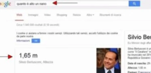 Google è il motore di ricerca per antonomasia, infatti la stragrande maggioranza degli internauti si affida ai server di Mountain View per compiere ogni giorno centinaia di migliaia di ricerche sul web. A molti però ha fatto sorridere il fatto che, almeno fino ad oggi pomeriggio, cercando la frase "quanto è alto un nano" su Google, il colosso americano restituisse come risultato della ricerca "1,65 centimetri Silvio Berlusconi Altezza" con a corredo l'immagine dell'ex Premier.