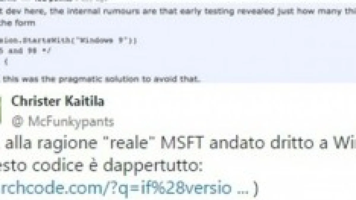 Egli ha detto: "Questa è stata la soluzione pragmatica per evitare confusione". Quindi, in sostanza, c'è un codice di vecchia data progettato per distinguere tra Windows 95 e 98 che non coglie un Windows 9. Lo sviluppatore Indie Christer Kaitila ha rivelato come molte applicazioni utilizzano quel codice ora-problematico: si tratta di ben più di 4000. Microsoft, da parte sua, non ha detto nulla sul perché è andato direttamente dalla 8 alle 10. Alcuni hanno ipotizzato che Microsoft stesse cercando di prendere le distanze da Windows 8 con il 10, molti dicono pure che dipende dal numero di kernel arrivato alla versione 7.3.