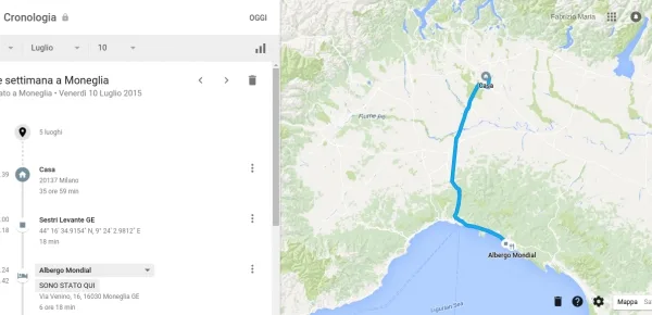 Usando una nuova e facile caratteristica di Google chiamata Cronologia (Your Timeline), potete vedere marcati su mappa, nel Web o in Android, tutti i luoghi da voi visitati con gli itinerari dettagliati dei viaggi. Anche se alcuni provano disagio alla prospettiva di avere Google che registra passo dopo passo tutti gli spostamenti, altri trovano che Cronologia è uno strumento utile per tenere traccia di viaggi e vacanze, compresi alberghi e ristoranti frequentati, o semplicemente per ricordarsi che cosa si è fatto un certo giorno.