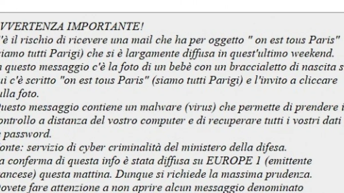 Leggete quanto appare nell’immagine a corredo di questo articolo ed una volta ragionato sul testo, appare in tutta la sua semplice sequela di frasi già lette in mail simili, la sua falsità. Sembra infatti un collage di vecchi allarmi, con un’aggiunta posticcia ai recenti fatti degli attentati di Parigi. Purtroppo, spesso questi messaggi arrivano da una persona vostra amica di cui vi fidate, ma si devono semplicemente ignorare ed avvertire il mittente spiegandogli della assoluta mancanza di fondamento, onde fargli rettificare l’allarme alla sua lista di spedizione.